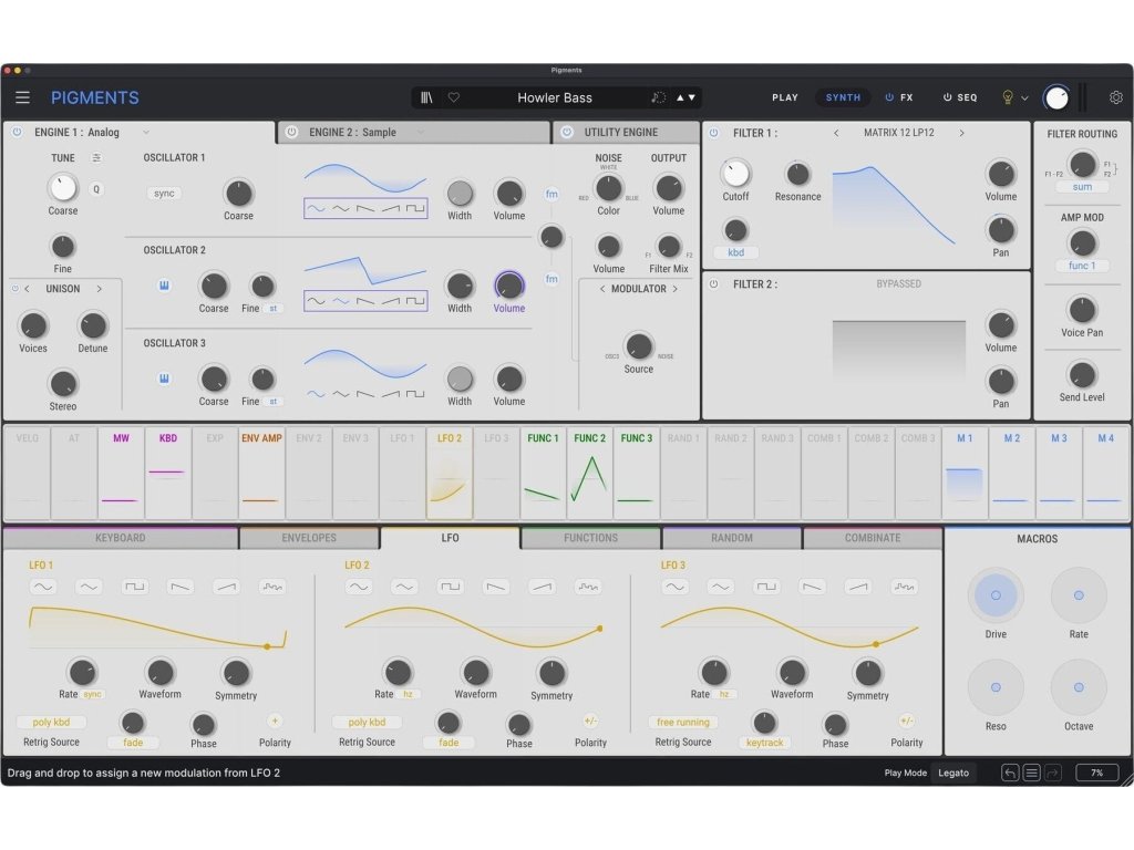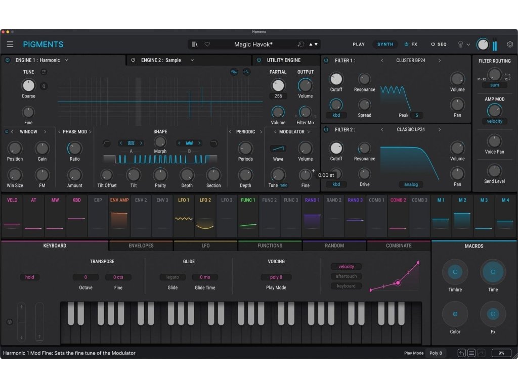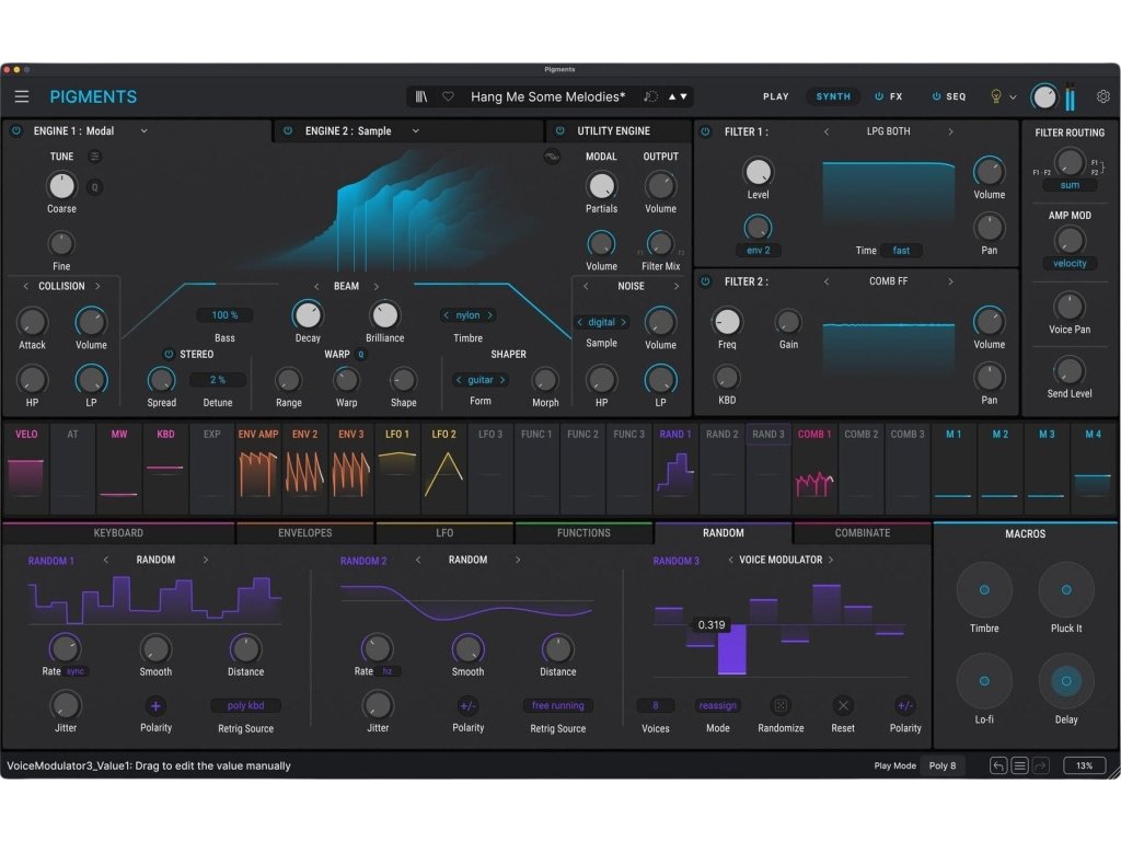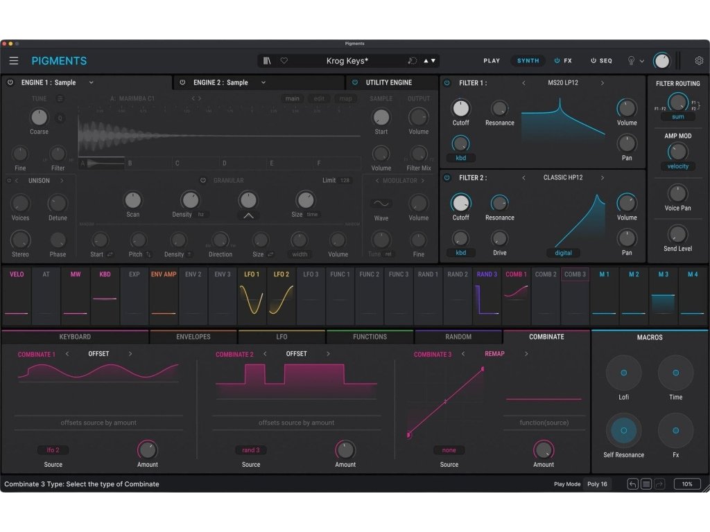 Kombinujte modálnu, granulárnu, wavetable, samplovú, harmonickú a virtuálnu analógovú syntézu, doplnenú o Utility engine, ktorý poskytuje ďalšie oscilátory a samplovaný šum. Pigments navyše umožňuje spracovávať aj externý audio signál. Pretavte svoje nápady do hotových zvukov pomocou vizuálneho workflow a audio-reaktívneho zobrazenia Play View.