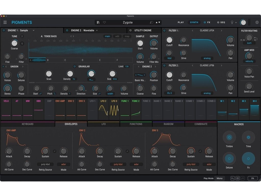 Vytvárajte mohutné, vrstvené zvukové krajiny ako so žiadnym iným syntetizátorom. Vďaka šiestim typom enginov, dvojici morfujúcich filtrov, 20 kvalitným efektom, pokročilej modulácii a kreatívnemu sekvencovaniu dáva hlboká zvuková architektúra Pigments plnú voľnosť vašej fantázii. K dispozícii sú až 3 engine sloty a 6 metód generovania zvuku.