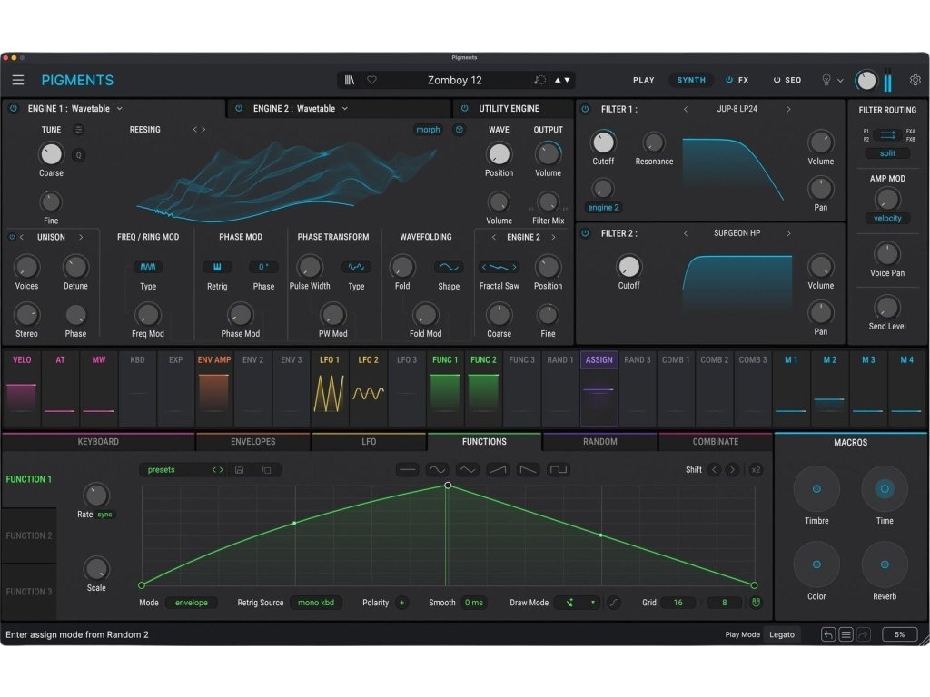 Pigments je komplexný softvérový syntetizátor pre moderných producentov, ktorý spája šesť pokročilých syntetických enginov, intuitívnu moduláciu typu drag-and-drop, prémiové efekty, generatívne sekvencovanie a prehľadné farebne kódované rozhranie reagujúce na hru aj úpravy zvuku. Je navrhnutý pre moderný, progresívny sound design bez obmedzení.