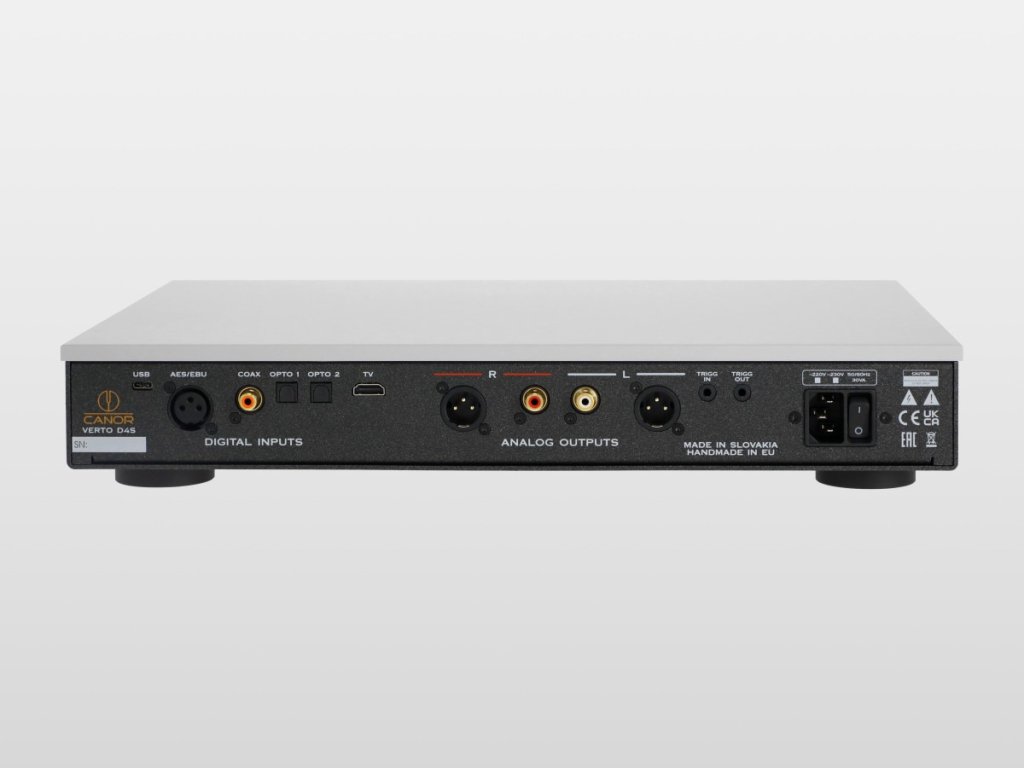 Verto D4S používa dual-mono zapojenie ESS Sabre 9038, vyladené pre vysoký dynamický rozsah a ultranízky šum. Analógový výstupný stupeň je plne diskrétny, bez operačných zosilňovačov v signálovej ceste. Galvanické oddelenie na USB, AES/EBU, koaxiálnom a optických vstupoch pomáha blokovať šum a rušenie, čím zachováva čistú a stabilnú cestu digitálneho signálu.