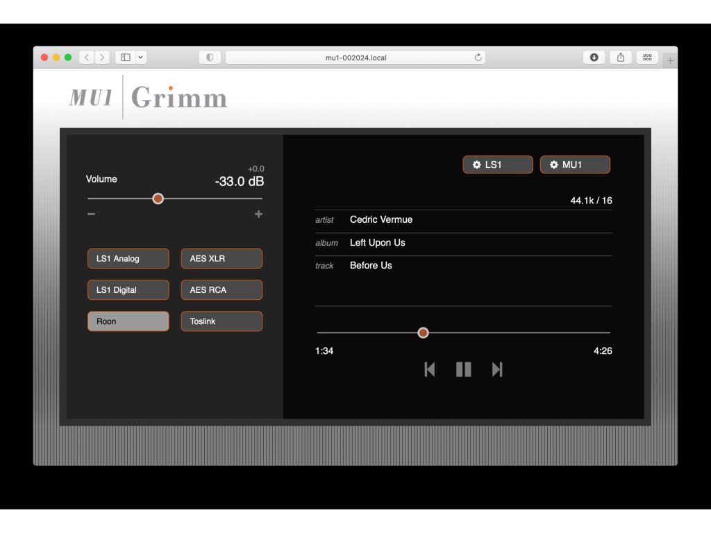 Netreba dodávať, že MU1 obsahuje naše značkové hodiny s ultra nízkym jitterom. Toto je hudobný prehrávač hodný mena Grimm Audio. Keď je zabezpečená vynikajúca kvalita zvuku, kvalita hudobného prehrávača je definovaná skúsenosťou používateľa. Za týmto účelom sme sa spojili s Roon Labs , ktorí sú podľa nášho názoru na čele, pokiaľ ide o bohatý a pútavý hudobný zážitok, ktorý osloví celú vašu rodinu. MU1 beží na serveri Roon, takže nie sú potrebné žiadne ďalšie inštalácie. Stačí vziať tablet a zažiť hudbu.